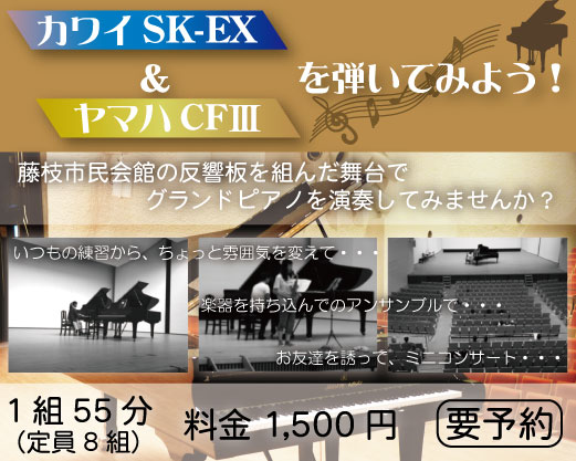 藤枝市民会館では、各種コンサート、発表会、講演会、演劇など様々な催事が開催されています。平成25年、耐震リニューアル工事を行い、新たに会議室や音楽等の練習が出来るリハーサル室が設けられ総合施設としての機能が充実しました。