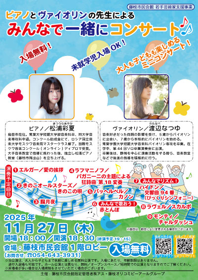 入場無料! 未就学児入場OK! 島田市在住のピアニスト・松浦彩夏さんと、静岡県内を中心に演奏活動をされているヴァイオリニスト・渡辺なつゆさんによるロビーコンサートを開催いたします!